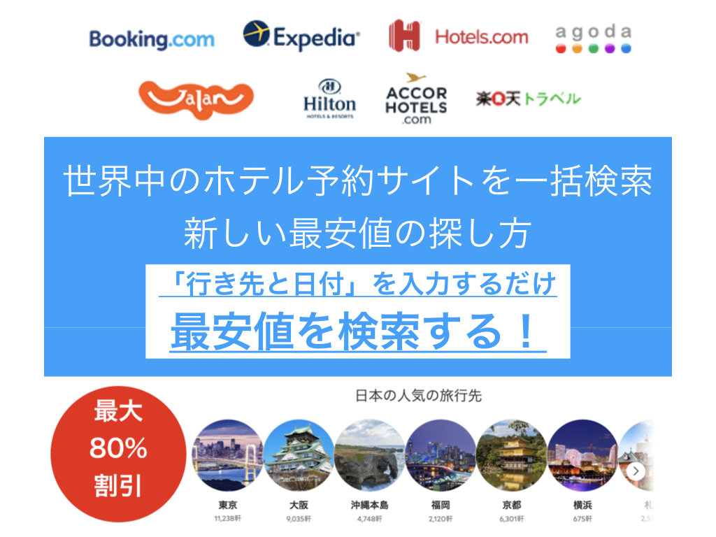 世界中のホテル予約サイトを一括検索できます!だからご希望ホテルの最安値(最大80%OFF)が簡単にわかります。さらにプラス全国旅行支援!キャンセル無料で後払いもできますので早めに予約しても安心です。