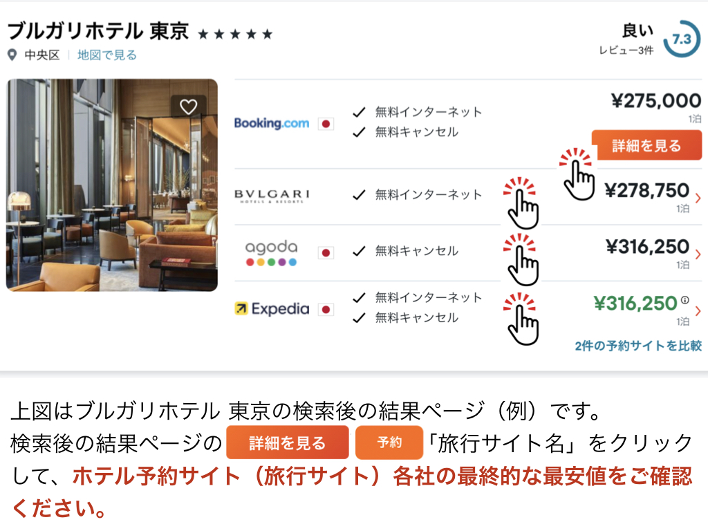 簡単にお好みのホテル・旅館を検索して各旅行サイトの料金を比較できます。目的地を入力し、日付を選択するだけで宿泊料金を比較。料金や距離(例:街の中心からの距離)、宿のランク、館内施設などの条件絞り込み機能使って検索を絞り込むことも可能。格安の宿から高級ホテルまでネット予約が簡単にできます。多種多様な宿泊プランが揃い、海外で人気のソウル 台北 ホノルル バンコク シンガポール グアム ローマ パリ ロンドン ニューヨーク ロサンゼルス トロント バンクーバーなどの都市から、東京・大阪・京都・沖縄・札幌や名古屋など国内都市まで幅広い選択肢の中から検索できます!